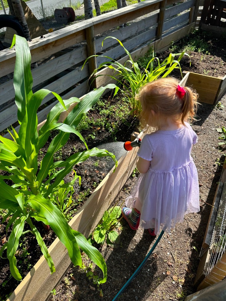 Giđđa er også tiden for å så. I barnehagens kjøkkenhage er barna aktive i prosessen med å så og følger prosessen fra frø til spire med nysgjerrighet. De er aktive i arbeidet med å ta vare og beskytte slik at naturen kan få utvikle seg slik at man kan høste av den senere på året. Gjennom dette arbeidet får barna innsikt i hvor mat kommer fra, erfaring med å ta ansvar over tid og forståelse for samspillet mellom mennesker og natur. Dette samsvarer med samisk naturforståelse og Rammeplanens mål om å legge grunnlaget for bærekraftige holdninger.