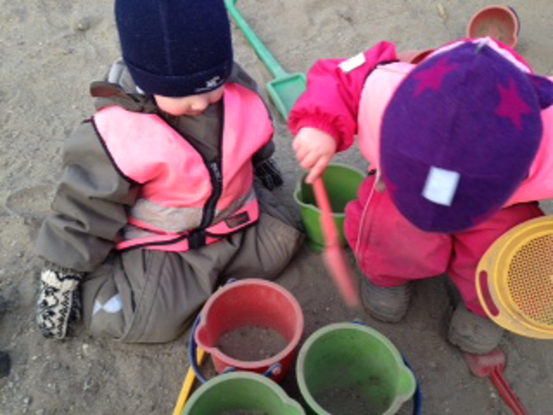 Ikke mye tegn på vinter. Furukonglene storkoser seg med bøtter, spader og traktorer i sandkassa, til tross for at vi har vinteraktiviteter på planene våre.