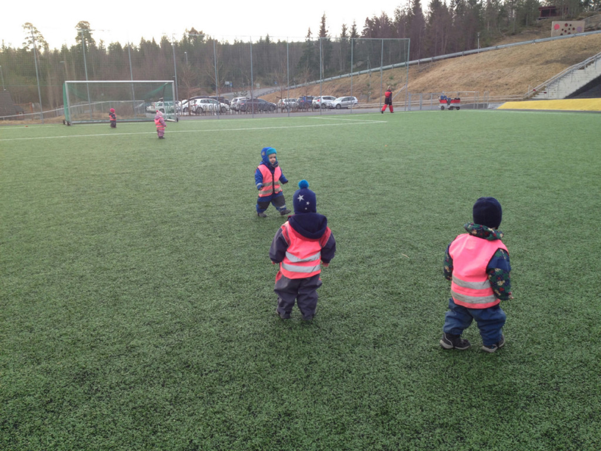 I dag var 2012-barna på fotballbanen. Kjekt når man har store områder man kan springe på. Målenettet var interessant å se på og gjennom, i tillegg fant vi ut at det går an å spille musikk med pinner på lyktestolpene.