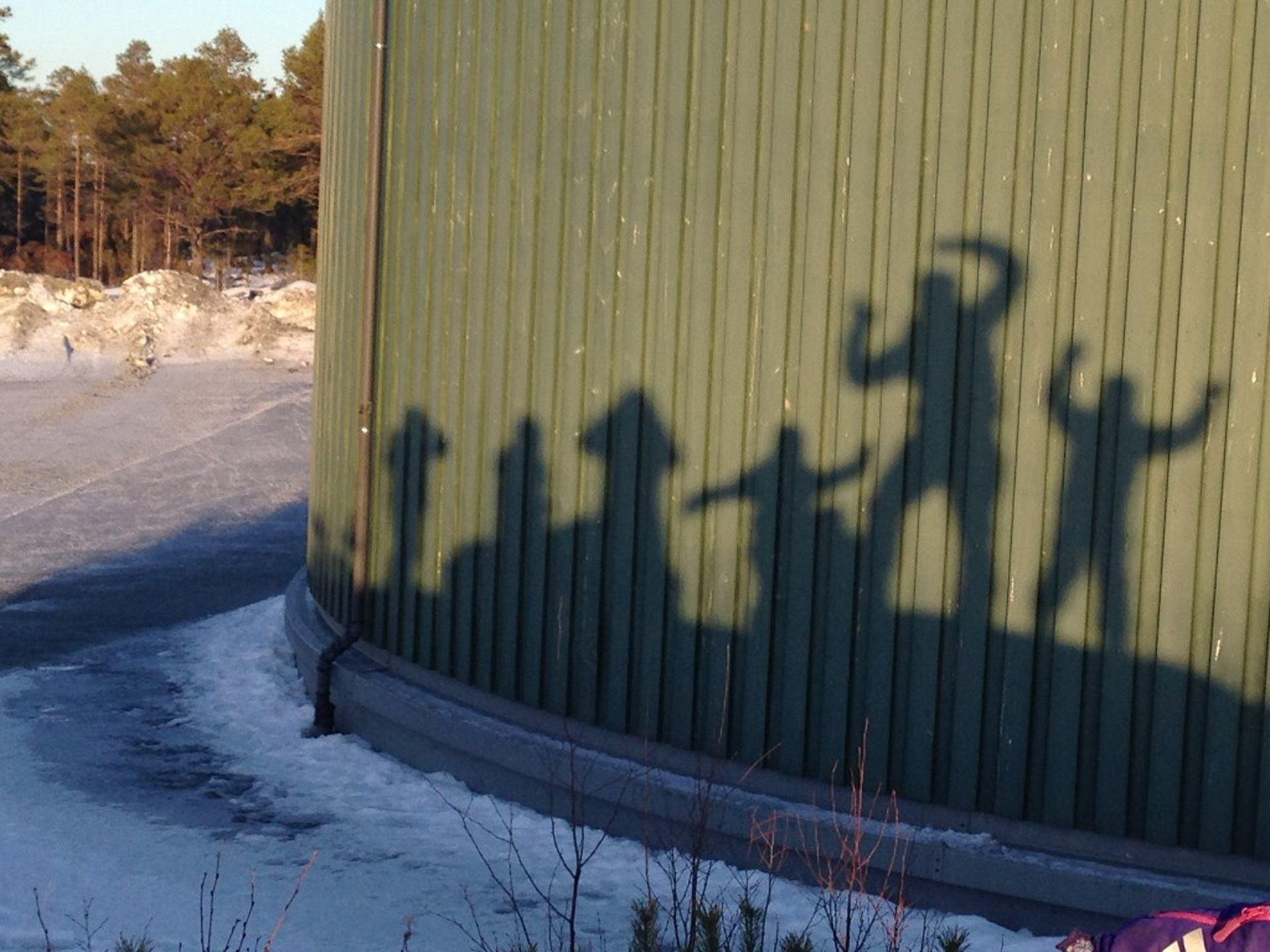 Fredag var Maurstua på tur ved Stavsjøen. Vi gikk opp til toppen ved vanntårnet, og her fikk vi se skyggene våre i stor skala på veggen. Det var spennende!