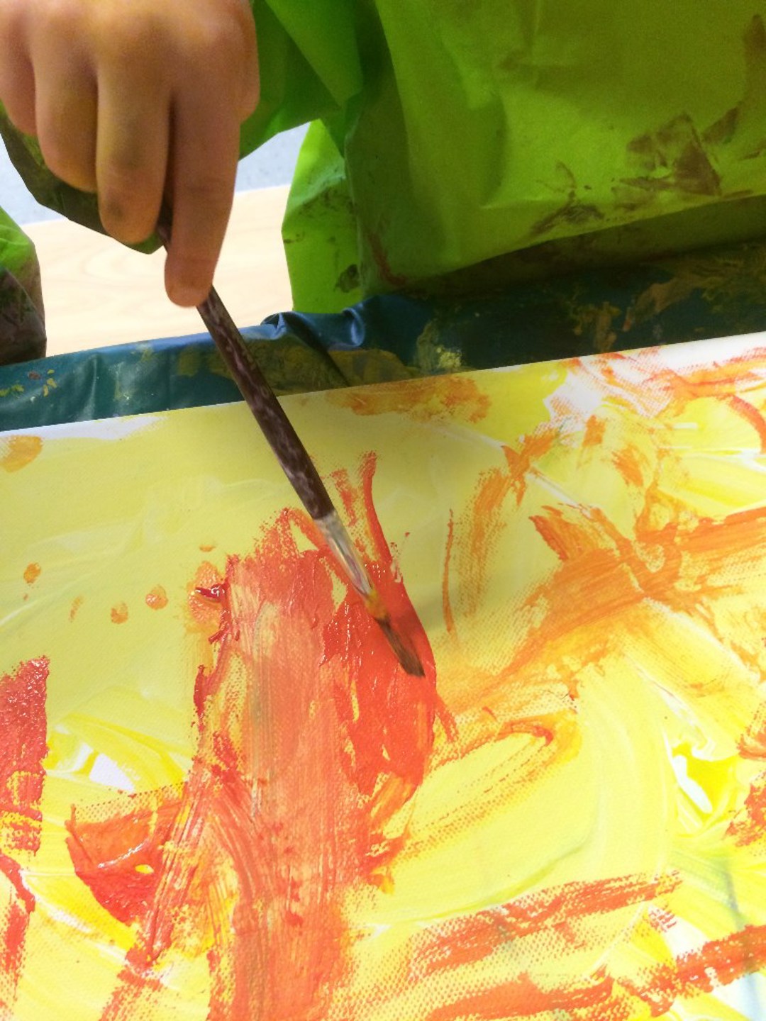 Vi blir kjent med fargene. Gul og rød blir oransje. Hva blir det hvis vi henter sand fra sandkassa og strør på lerretet? Jo det blir musikk. For noen fine "skurrelyder". Rytmeorksteret var klart og den pedagogiske lederen måtte bare hive seg på og dikte sanger til rytmene. En hærlig stund med våre 2-og 3 åringer på Bjørka.