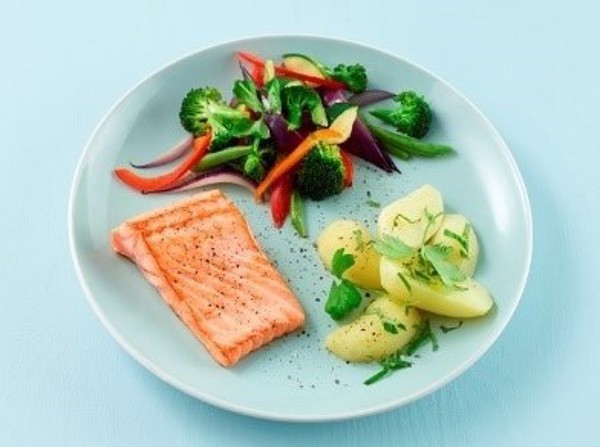 Tallerkenmodellen legger vekt på at frukt, bær eller grønnsaker utgjør halvparten av måltidet, og karbohydrat- og proteinkilden omtrent 1/4 av måltidet.